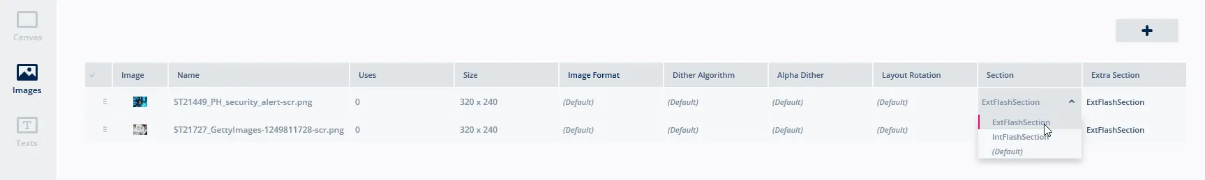 Images 탭으로 이동하여 이미지를 선택합니다. 창의 오른쪽에서 "Section" 속성을 "IntFlashSection"으로 변경합니다.
