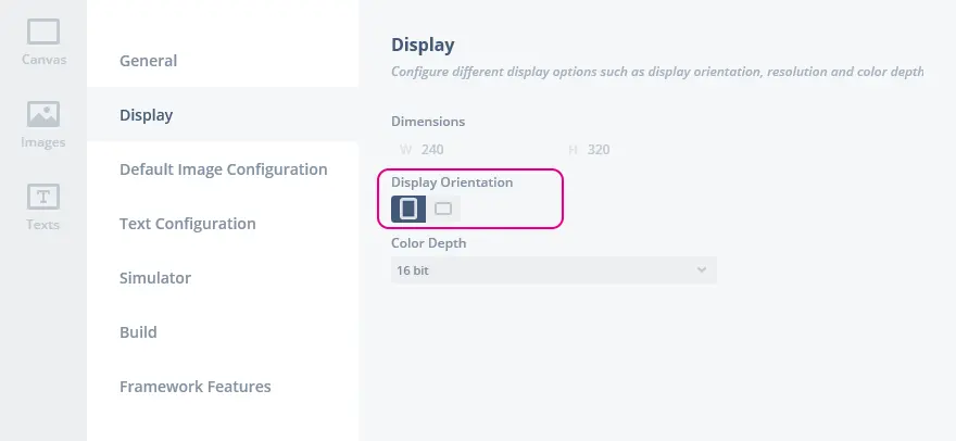 TouchGFX 보드 설정은 NOR 플래시, 디스플레이 및 버튼을 지원합니다. 디스플레이는 세로 및 가로 모드에서 모두 사용이 가능합니다.