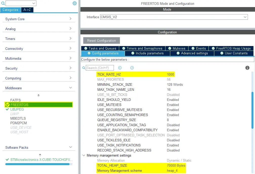 Having enabled FreeRTOS in a project, navigate to the FREERTOS menu found under Middleware in the "Categories" list on the left side of the project menu in STM32CubeMX. 밀리 초마다 한 번씩 틱이 발생하도록 TICK_RATE_HZ