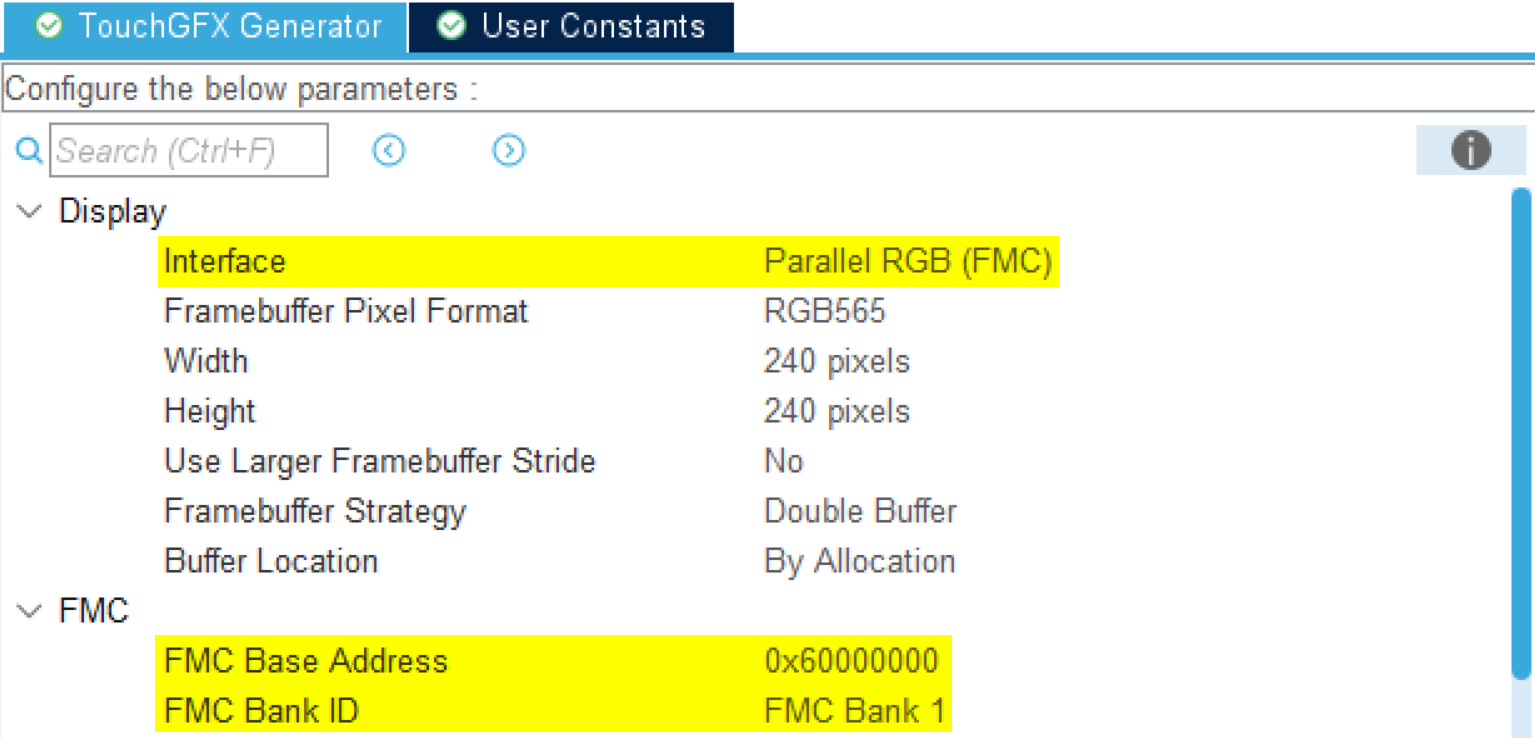 사용되는 디스플레이에 맞춰 타이밍을 올바르게 설정해야 합니다. MCU에 대한 FMC의 기본 주소와 디스플레이에 연결하는 데 사용된 뱅크를 확인하세요.