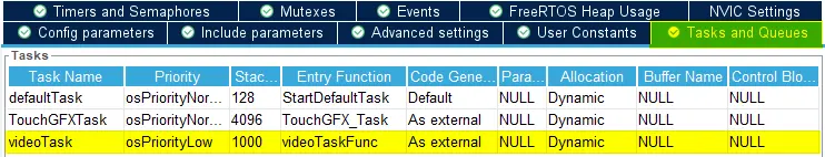 The Generator User Guide mentions that Single- and Double buffer video decoding strategies require a CMSIS compliant RTOS, such as FreeRTOS. TouchGFX Generator는 비디오 디코딩 테스크에 연결해야 하는 엔트리 포인트 함수 videoTaskFunc()