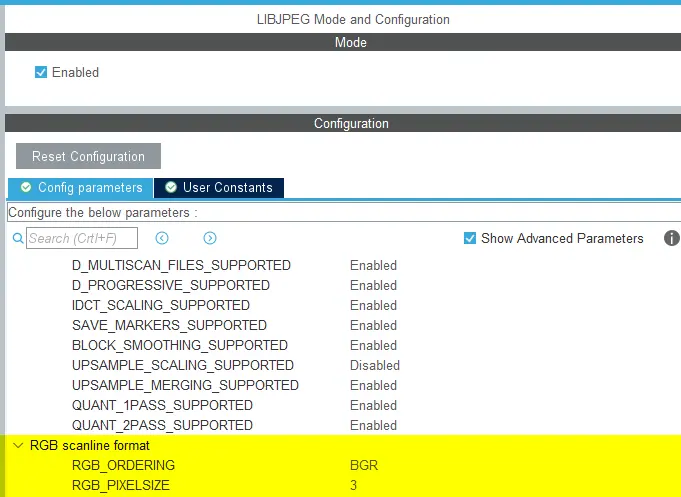 소프트웨어 디코딩 솔루션을 사용하려면 Generator User Guide에 나와 있는대로, STM32CubeMX에서 LibJPEG 미들웨어가 활성화되어 있어야 합니다. 소프트웨어 디코딩 설정은 LibJPEG를 지원하는 MCU(예: STM32F4, STM32F7, STM32H7)에서 모두 동일합니다.