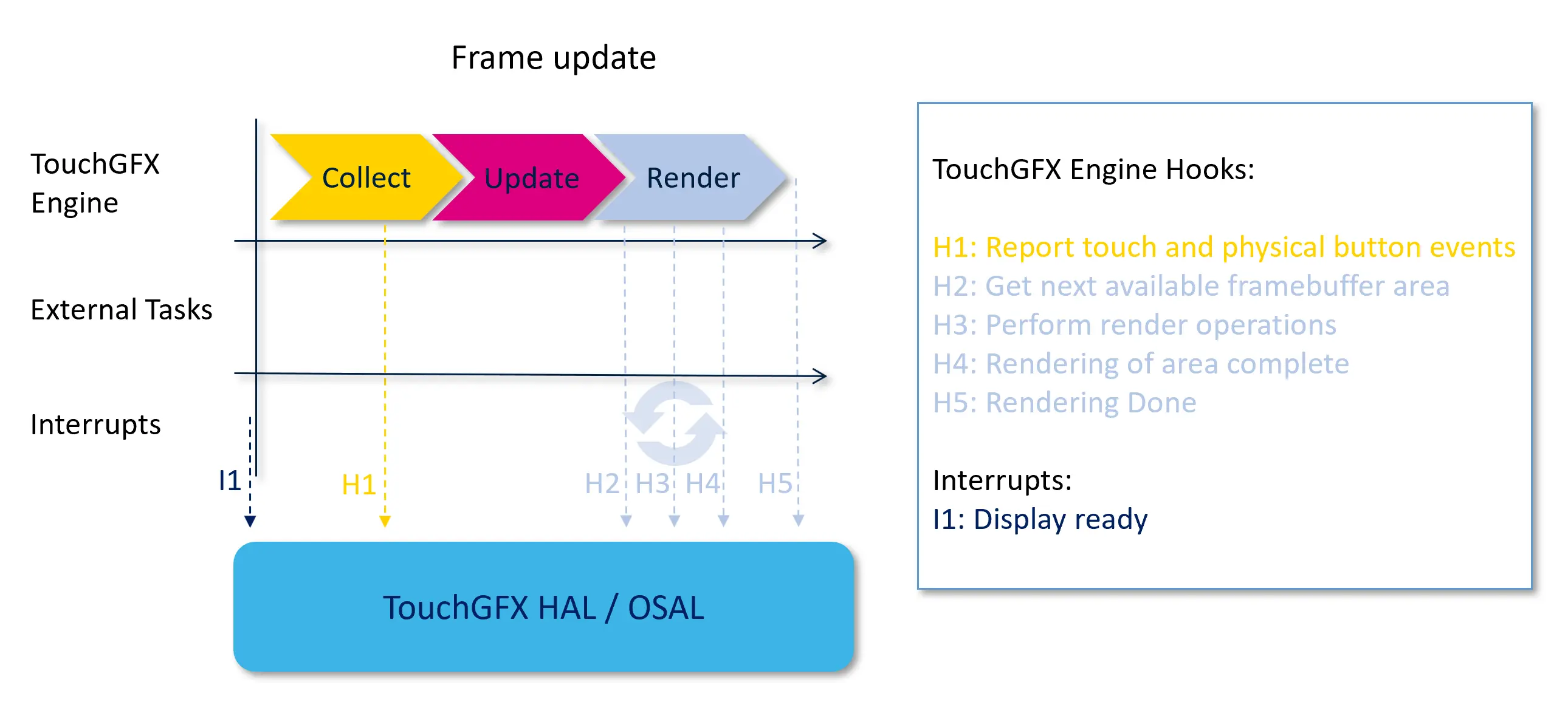 기반 하드웨어와 OS에서 TouchGFX AL의 책임이 수행되도록 이러한 후크를 구현하는 것은 TouchGFX AL 개발자의 몫입니다. 이러한 책임을 지원하기 위해 다른 방법이 필요한 경우, TouchGFX AL 개발자는 특정 지점을 활성화하도록 인터럽트를 설정할 수 있습니다. LTDC 수직 동기화 인터럽트와 하드웨어 타이머가 바로 이러한 예입니다. I1: Display ready 인터럽트는 수직 동기화 인터럽트의 예입니다. 이러한 인터럽트의 설정은 Al 개발의 일환으로 여겨진다는 점에 유의하십시오.