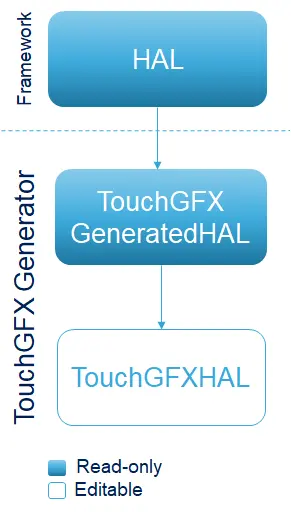 TouchGFX AL은 구체적인 하위 클래스와 TouchGFX Engine에 정의된 클래스의 멤버 함수가 구현되는 클래스 구현 파일(.cpp)을 통해 TouchGFX Engine이 액세스합니다. 이러한 하위 클래스 및 클래스 구현 파일은TouchGFX Generator에서 생성됩니다. TouchGFX Generator는 STM32CubeMX의 구성을 반영하는 HAL 부분과 사용된 RTOS에 대한 OSAL을 모두 생성할 수 있습니다. 자세한 내용은 TouchGFX Generator 섹션을 참조하시기 바랍니다. 일반적으로 HAL의 아키텍처는 아래 그림과 같습니다.