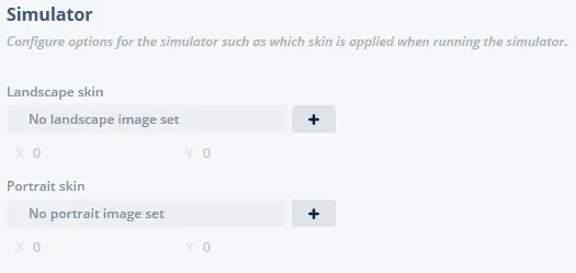 이 섹션에서는 Simulator 실행 시 스킨을 추가할 수 있습니다. 스킨은 가로 방향 프로젝트와 세로 방향 프로젝트에 모두 추가할 수 있습니다. X 속성과 Y 속성은 스킨에서 Simulator의 위치를 결정합니다.