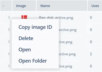 폴더 노드를 클릭하면 해당 폴더에 저장된 이미지가 테이블 뷰에 표시됩니다(루트 폴더인 “images”를 클릭하면 하위 폴더에 저장된 이미지를 포함해 애플리케이션에 저장된 이미지가 모두 표시됩니다).
