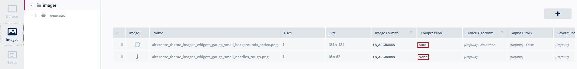 L8 이미지의 L8 압축을 선택하면 메모리 소비를 훨씬 더 줄일 수 있습니다. 이미지 변환 프로그램은 3가지 압축 알고리즘(L4, RLE, LZW9)을 지원합니다. In TouchGFX Designer you can set the Compression value to "Auto", this will let the Image Converter select the suitable algorithm for your image, alternatively you can force a specific algorithm. 메모리 사용량을 절감할 수 있다는 이점이 있지만, 경우에 따라 이미지를 그릴 때 프레임 버퍼에 대한 직접 압축이 압축되면서 CPU 부하가 증가하는 단점이 있습니다.