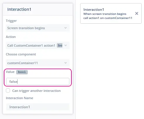 커스텀 트리거가 포함된 커스텀 컨테이너를 스크린에 추가하면 커스텀 트리거를 아래 이미지와 같이 스크린의 상호작용에 있는 트리거로 사용할 수 있습니다.
