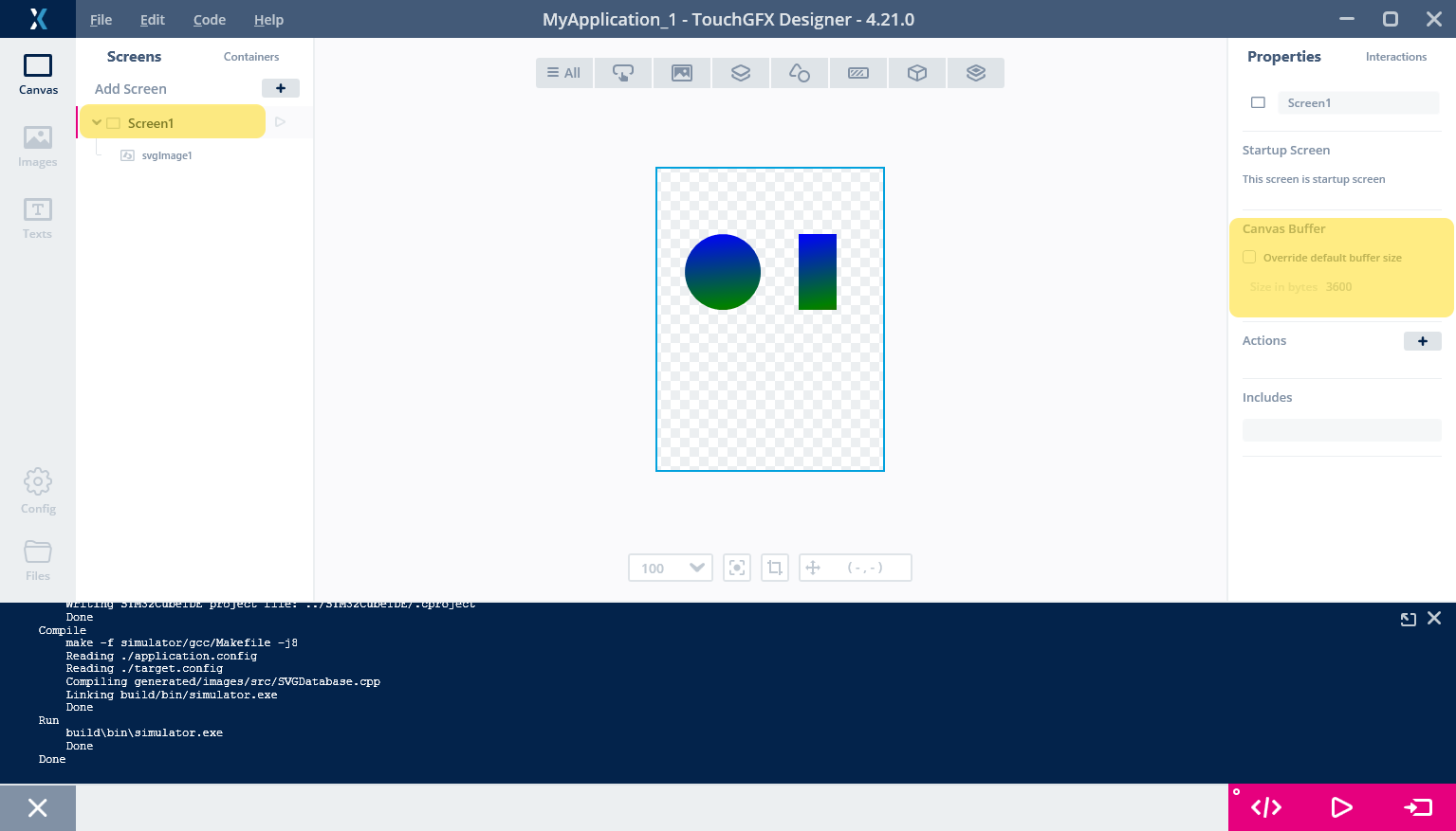 대부분의 플랫폼(U5X9 제외)에서 SVG는 캔버스 위젯 렌더러를 사용해 렌더링이 됩니다. 이 소프트웨어 구성 요소는 렌더링 중에 버퍼를 사용합니다. 이 버퍼의 크기는 성능에 영향을 미칩니다. 가능하면 버퍼 크기를 늘리는 것이 좋습니다(종종 20-30Kb가 적당). 버퍼는 TouchGFX Designer에서 손쉽게 변경이 됩니다.