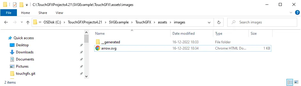 이 SVG를 TouchGFX와 함께 사용하기 위해 파일(arrow.svg)을 프로젝트의 assets/images