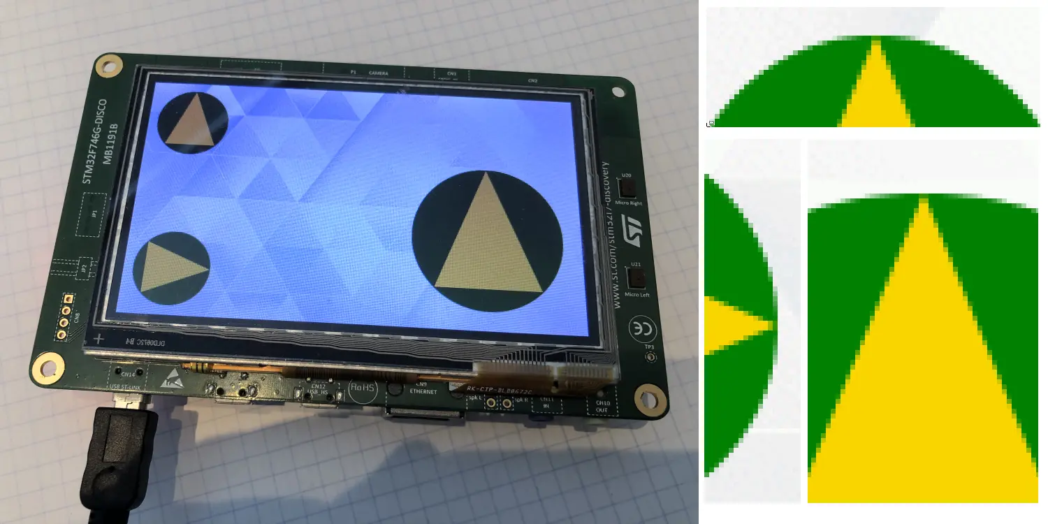 SVG 화살표의 렌더링 시간은 STM32F746(외부 RAM의 프레임 버퍼)에서 1.32ms이기 때문에 매우 유용합니다. H7 시리즈의 MCU는 속도가 더 빠르기 때문에 렌더링 시간이 단축됩니다. 회전이 크게 추가되지 않는 상태에서 SVG가 확대(렌더링할 픽셀이 증가)되면 렌더링 시간이 늘어납니다. 이 그림은 STM32F746 디스커버리 키트의 화살표를 보여줍니다.