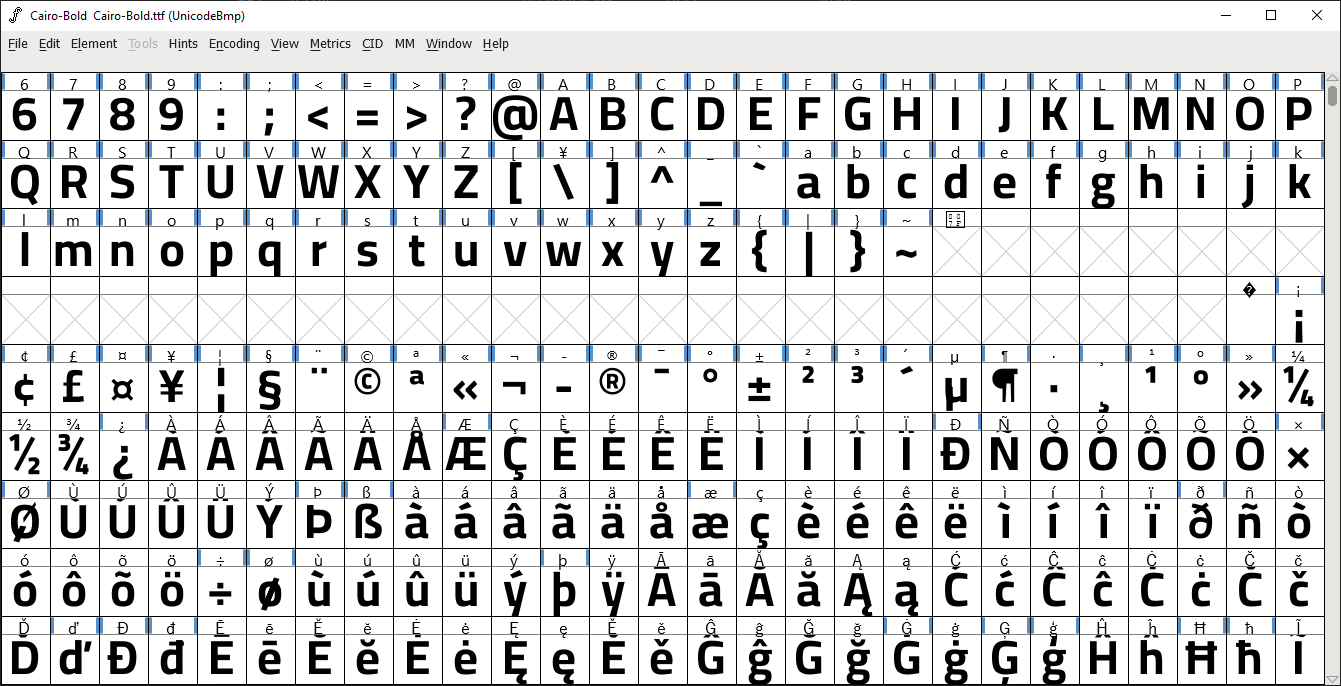 )로 이동합니다. FontForge가 애플리케이션의 모든 TrueType 글꼴을 감지합니다. 이 예에서 Cairo-Bold.ttf TrueType 글꼴은 올바로 그려지지 않는 겹치는 윤곽선을 가지고 있습니다.