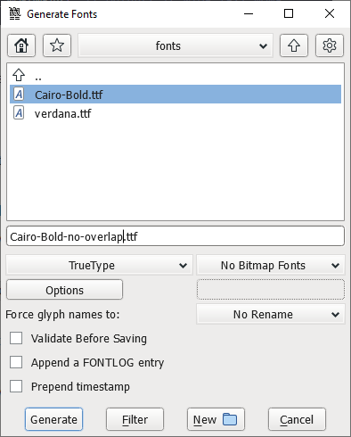 단축키를 사용하여 글꼴을 내보냅니다. 이렇게 하면 글꼴 생성 뷰가 열립니다. 오류가 발생했을 때 원본 글꼴을 덮어쓰는 것을 방지하기 위해 예를 들어 "-no-overlap"과 같은 접미사를 붙여 타이포그래피 이름을 바꾸는 것이 좋습니다. 출력 형식으로 TrueType