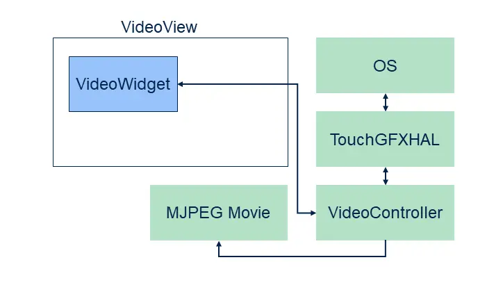 Video 위젯은 여느 위젯과 마찬가지로 사용자 인터페이스에서 사용됩니다. 비디오 컨트롤러는 전체 TouchGFX 환경을 구성하는 로우 레벨 소프트웨어(HAL, 운영 체제, 드라이버 등)의 한 부분입니다.