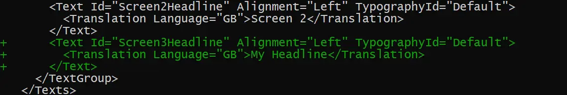 개발자는 파일과 커밋을 모두 추가합니다. texts.xml의 diff(아래 참조)는 ID가 Screen2Headline인 Text XML 요소와 영어 텍스트가 있는 Translation 요소를 추가했음을 보여줍니다. Text 요소는 새 TextGroup 요소 안에 있습니다. This element was created by TouchGFX Designer because we did not put our new text in a specific group: