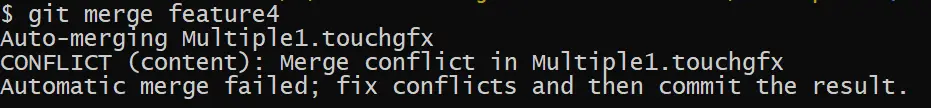 다시 말하지만 feature3을 메인 브랜치에 병합하는 것에는 문제가 없지만, 다른 Feature 브랜치를 병합할 때는 .touchgfx 파일에서 동일한 줄이 수정되었기 때문에 충돌이 발생합니다.