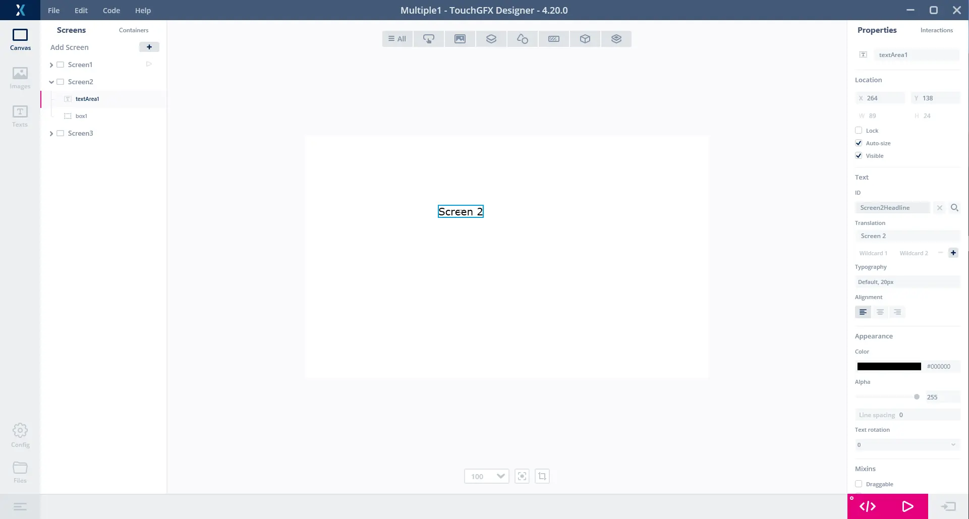 이제, 선호하는 편집기에서 feature2.touchgfx 및 Multiple1.touchgfx를 열고 feature2.touchgfx에서 Multiple1.touchgfx로 전체 Screen3 정의를 복사합니다. 그 결과는 다음과 같습니다(화면 사이의 쉼표를 기억).