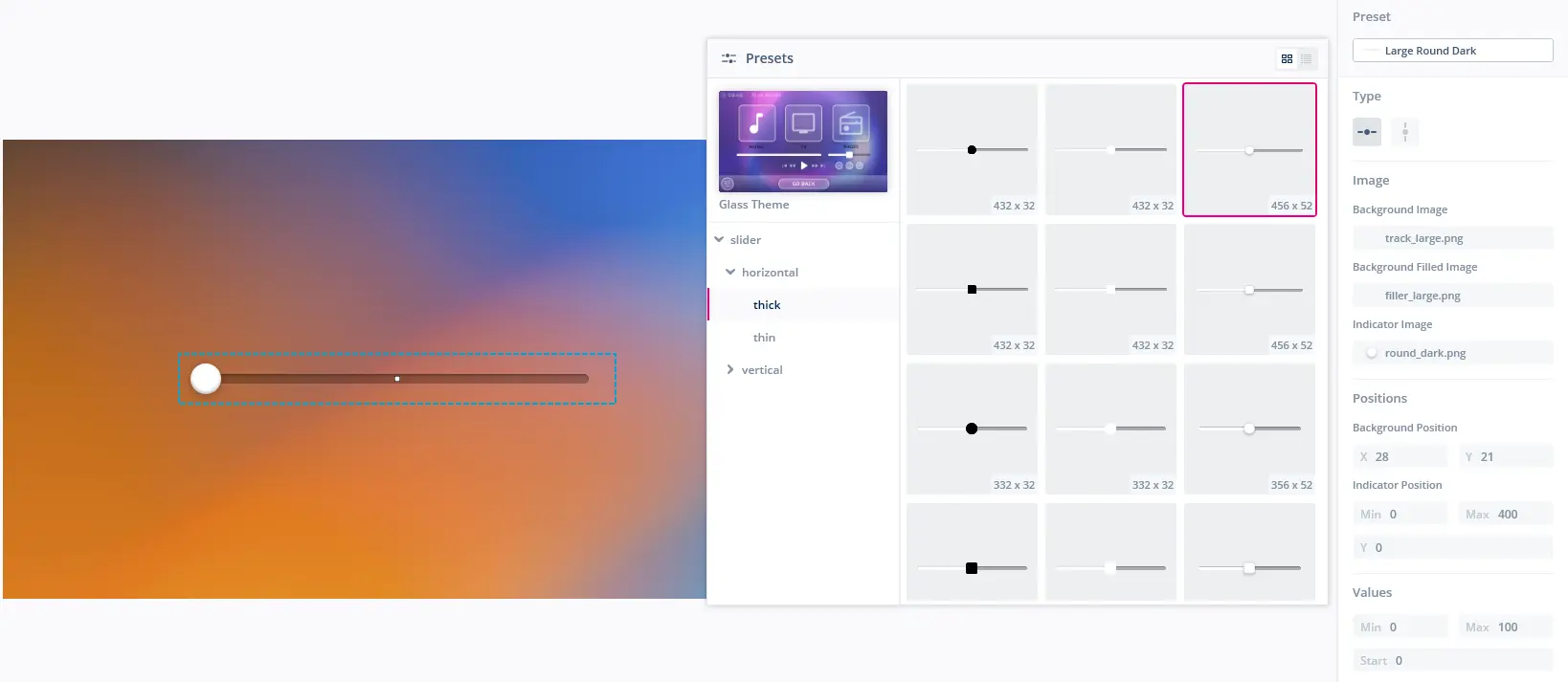 애플리케이션에 새 위젯을 삽입하면 해당 위젯에 대한 기본 사전 설정이 선택됩니다. 사전 설정이란 해당 위젯 유형에 대해 미리 정의된 시각적 모양입니다. 위젯에 사용되는 이미지가 될 수도 있고, Button With Icon 내부에 배치된 아이콘이나 슬라이더의 최소 및 최대 노브 위치와 같이 시각적 모양에 영향을 미치는 기타 매개변수 설정이 될 수도 있습니다.