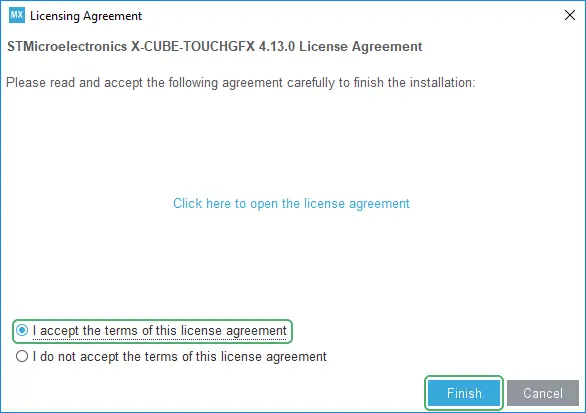 라이선스 계약을 읽고 동의한 후 "Finish"를 클릭해서 STM32CubeMX 내부에 TouchGFX Generator를 설치하십시오.