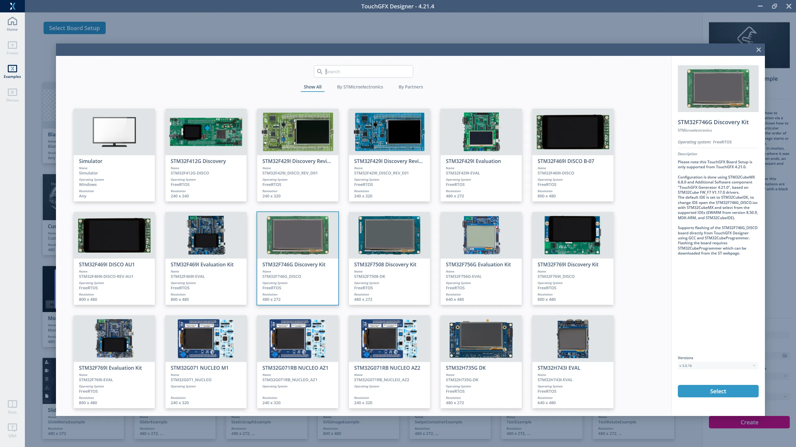 您既可以将示例作为项目的起点,也可以将它们作为参考示例。 您可以在PC上(使用TouchGFX Simulator)、STM32评估套件上甚至是基于STM32的定制硬件上运行示例。