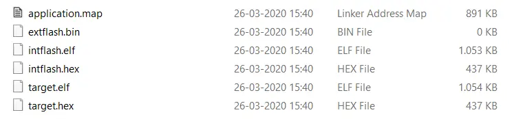 如果您点击右下角的“文件”按钮 (4),TouchGFX Designer将打开文件浏览器,其中显示了新项目所在的目录。 导航到build\bin,可以看到以下文件: