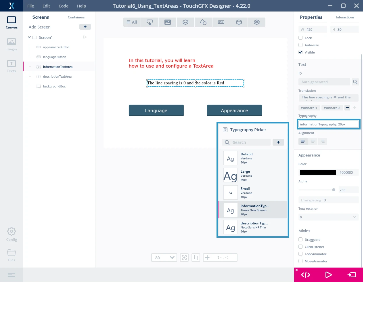 返回Canvas(画布)选项卡并选择informationTextArea。 在右侧面板的文本类别中,可以修改字体排印。 将其变更为informationTypography。