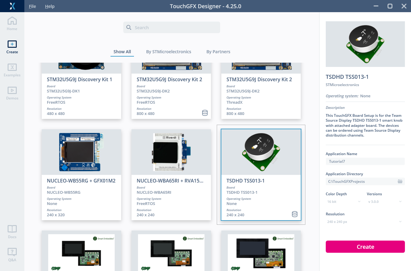 - Under the "Create" tab, select the board called "TSDHD TSS013-1".
