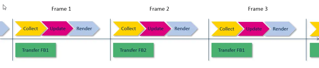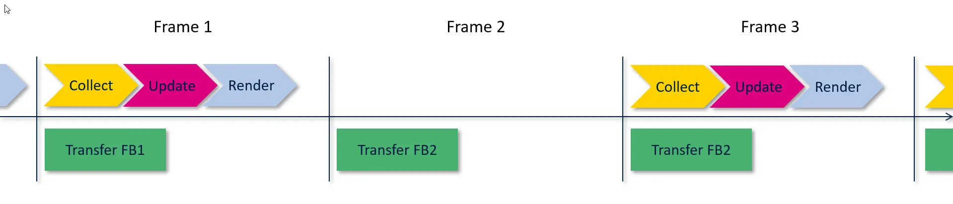由于图形引擎不得不在向显示屏发送帧缓冲的同时将帧绘制到同一个帧缓冲,因此会产生问题。 如果不加注意就这样做,会有一个极大的风险,即显示屏会显示上一帧与新帧的混合帧。