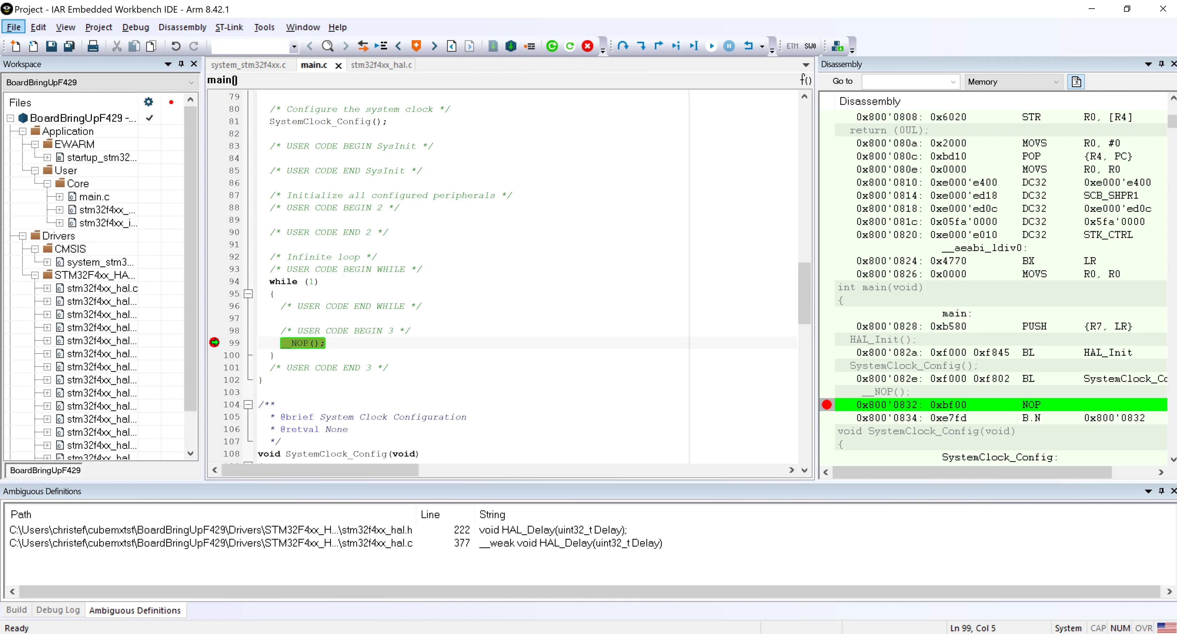 现在可通过IDE编译和调试项目。 在IAR中,点击“项目”->来编译项目,点击“项目”->来调试项目: