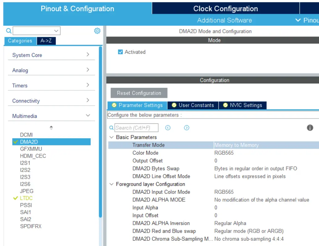 在STM32CubeMX中,Chrom-ART在“Multimedia ”->“DMA2D”类别下进行配置。 激活DMA2D,并根据您的显示屏配置传输模式和颜色模式。