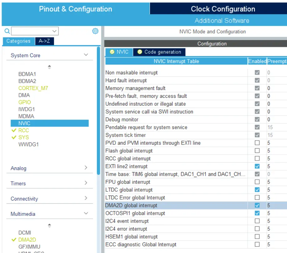 DMA2D全局中断对于TouchGFX应用中的帧缓存访问同步至关重要。 确保在STM32CubeMX NVIC设置中使能全局中断(NVIC选项卡),并为中断处理程序使能了代码生成(“代码生成”选项卡),如下所示。 在该阶段,优先级并不重要。