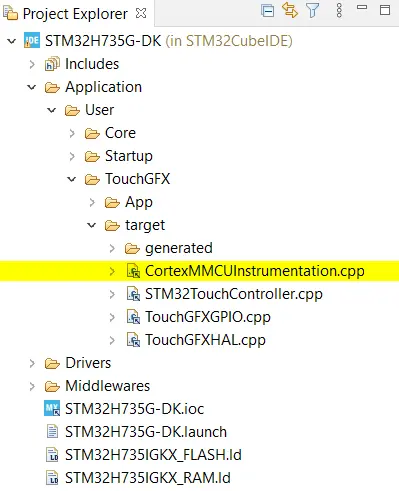 对于上面的STM32H735G-DK示例,文件cortexmmcuinstrumentment.cpp应该位于其指定的位置/TouchGFX/target/ cortexmmcuinstrumentment.cpp,