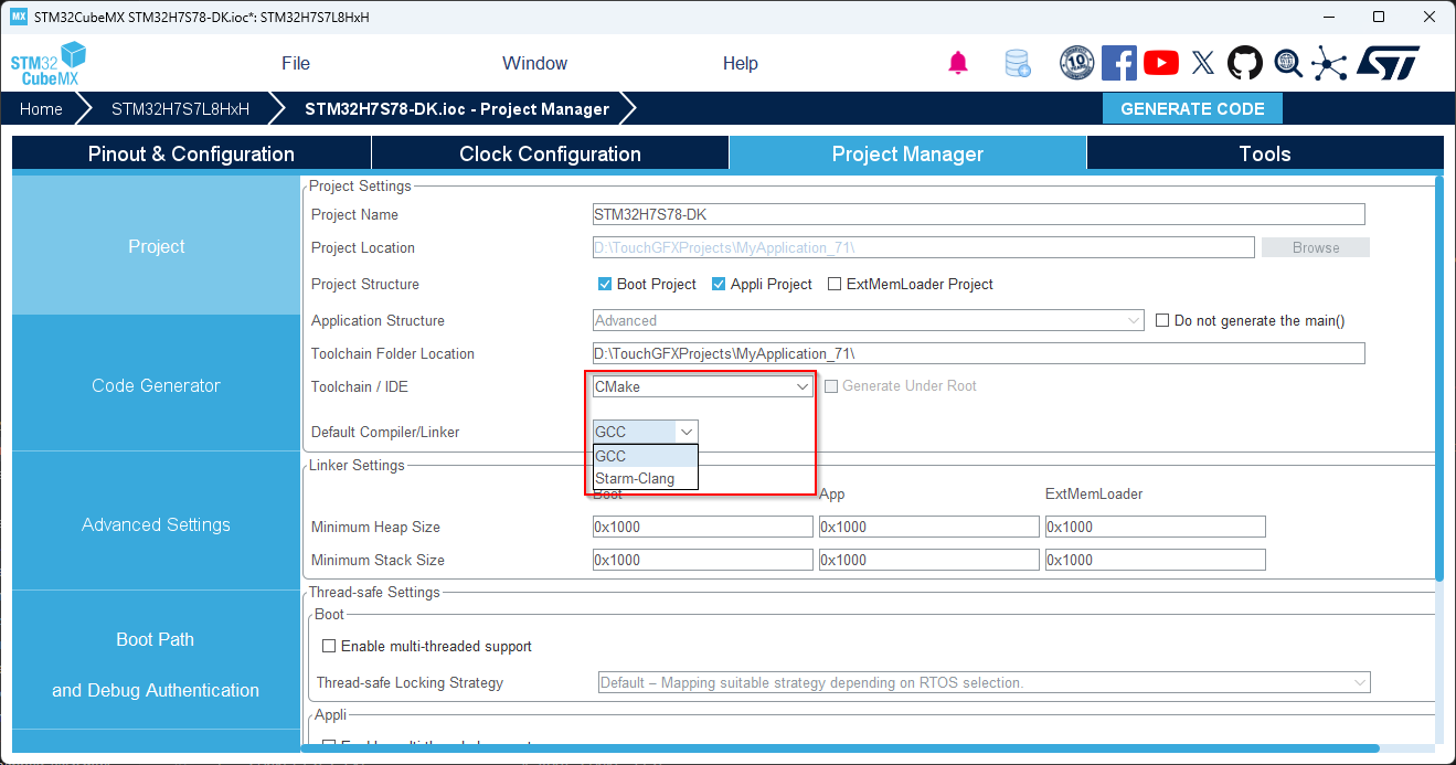 首先,在STM32CubeMX的“Project Manager”选项卡中将工具链更改为CMake。 随后生成代码。