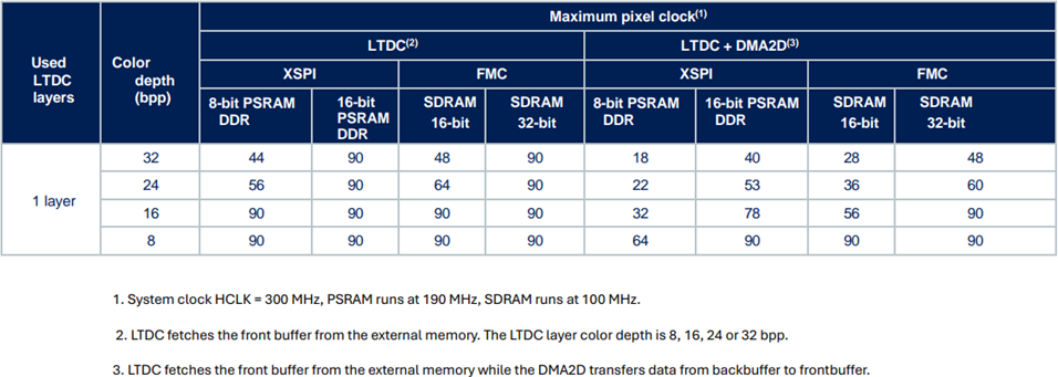 STM32H7R/S支持的最大像素时钟详见下方插入的LTDC应用笔记表13。