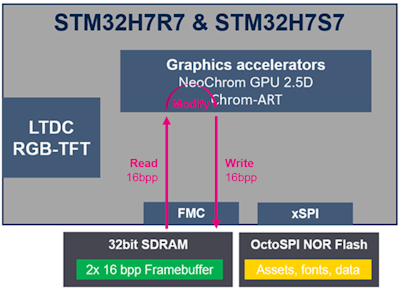 本节介绍如何计算下图所示典型配置的图形性能。 示例采用1024x600像素的高分辨率24位RGB-TFT显示屏,帧缓存为16bpp格式并存储于外部32位SDRAM中。 图形资源存储在外部OSPI NOR Flash中。