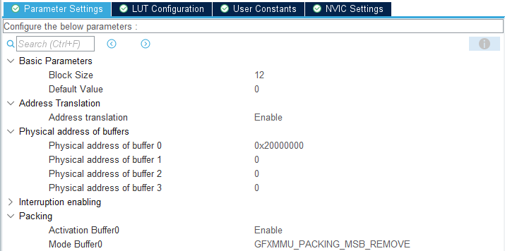 当使用部分缓存 - LTDC驱动显示屏帧缓存策略时,必须启用并配置GFXMMU。 GFXMMU用于将LTDC读取的帧缓存地址映射到物理内存中部分帧缓存块的地址。