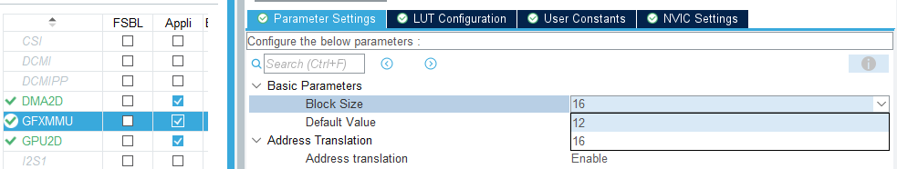 首先在STM32CubeMX的多媒体部分下启用GFXMMU,然后启用地址转换。 对于16位和32位帧缓存像素格式,建议使用16字节的块大小。 对于24位帧缓存像素格式,需要使用12字节的块大小。