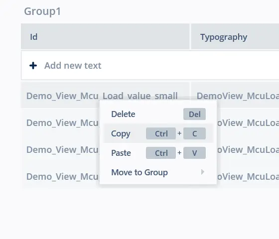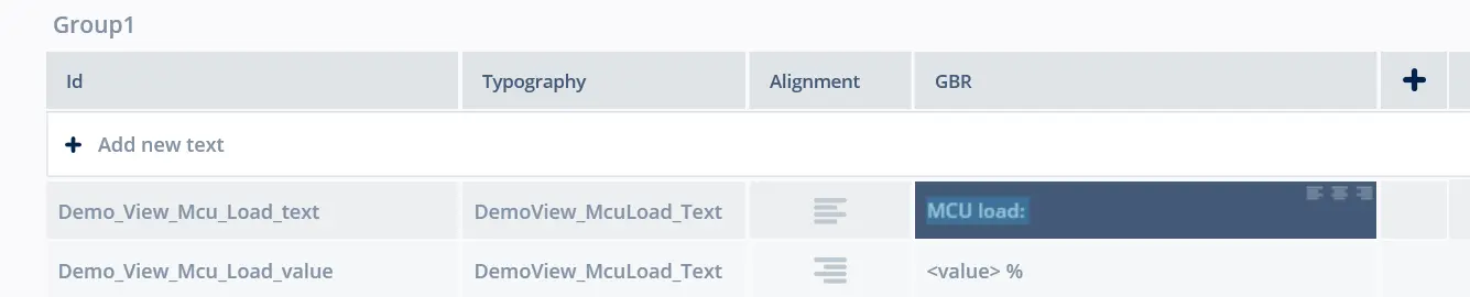 Texts with a defined ID (also known as Resources) can be reused on any number of widgets and actions in TouchGFX Designer. 要使用定义的ID添加新文本,请单击文本选项卡中标记为“添加新文本”的按钮,或使用自动生成的ID对文本重新命名。 通过在网格或树形视图中选中并单击右键打开快捷菜单或使用键盘快捷键,可在“文本”选项卡中删除具有自定义ID的一个或多个文本。