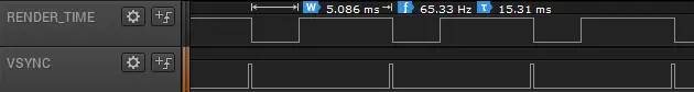 较低的信号是VSYNC,在像素时钟开始输出到屏时,每帧都有一个从高向低的转换过程。 在上面测量中可以看出,绘制单帧占了屏显7帧的时间。 在第8个VSYNC信号时开始下一帧的渲染。 在渲染过程中,显示屏重复显示已绘制的上一帧的内容(在另一个帧缓冲中)。