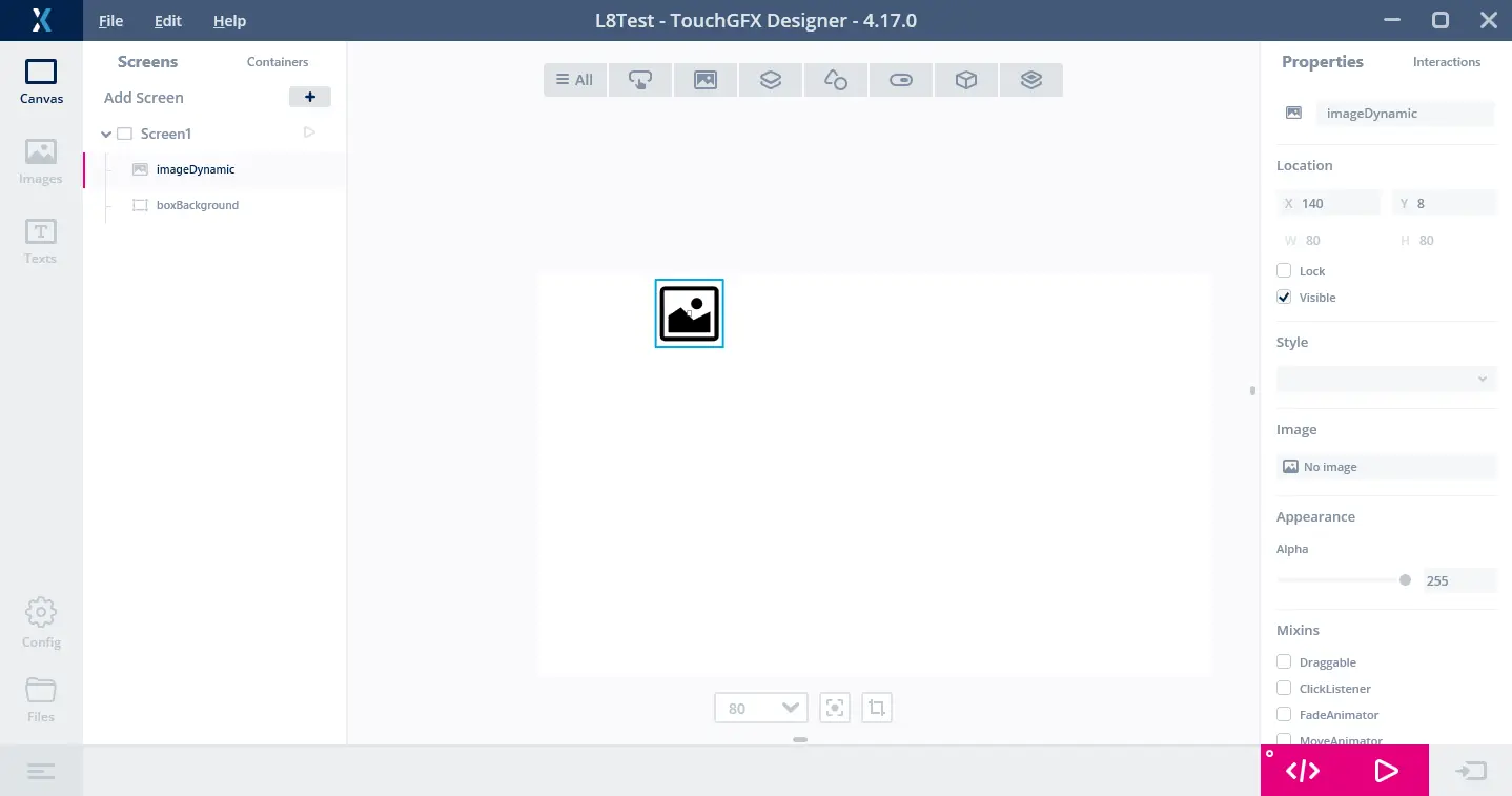 首先,使用TouchGFX Designer,创建一个屏幕,并在背景上插入一个白色方框和一幅图像,例如在(x=140, y=8)的位置:
