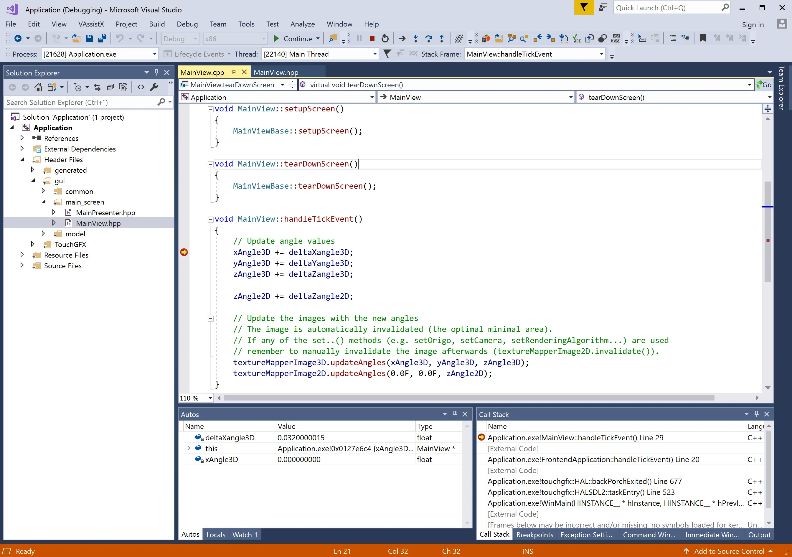 由于TouchGFX应用程序是一组由TouchGFX Designer、TouchGFX Generator生成并由开发人员编写的C++文件,因此可以像任何其他C++应用程序一样调试。