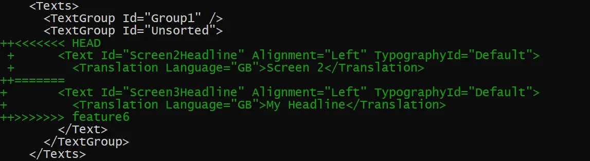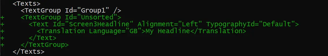 开发人员添加两个文件并提交。 texts.xml的差异(见下文)显示,我们添加了一个ID为Screen2Headline的TextXML元素和一个带英语文本的Translation元素。 文本元素位于新的TextGroup元素内。 This element was created by TouchGFX Designer because we did not put our new text in a specific group: