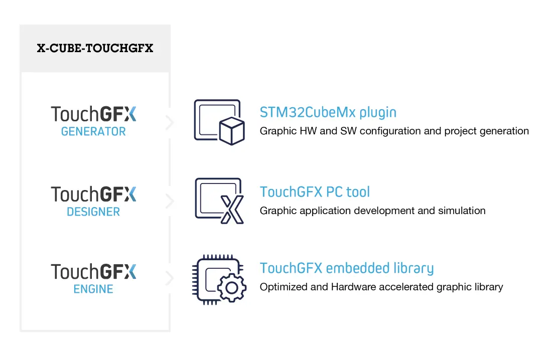 该软件包为您全面实施基于STM32的GUI应用开发提供了所需的一切。 TouchGFX包含三个主要部分 - 两个工具和一个框架。