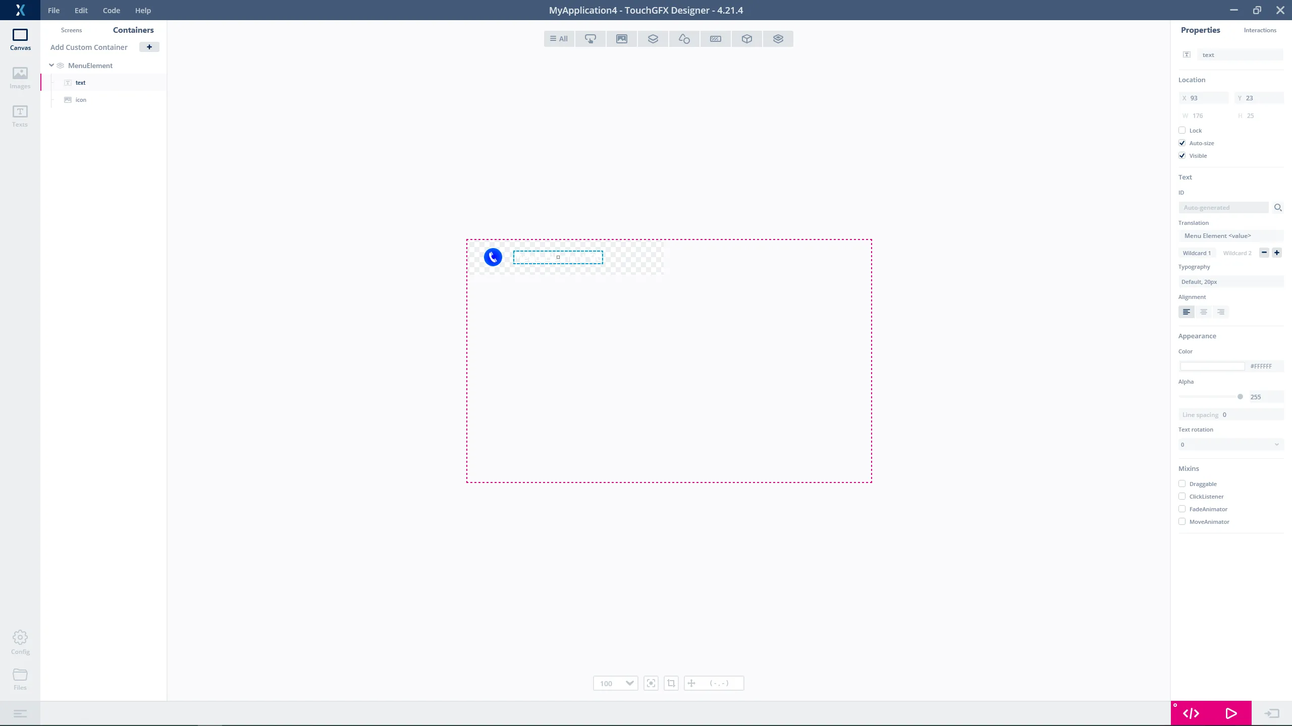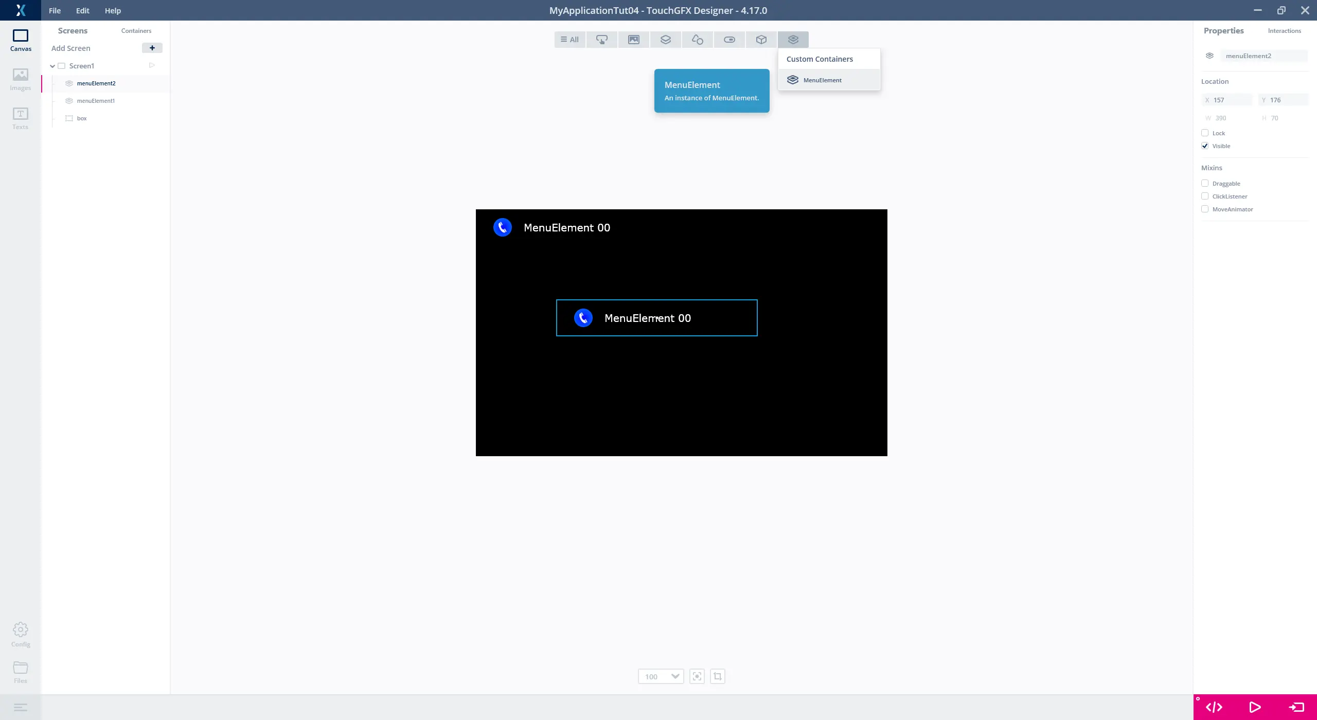 Similar to step 1 in tutorial 2, start by creating a new project with TouchGFX Designer. This time when the new project is ready, change from the screens tab in TouchGFX Designer to the Container tab (1).