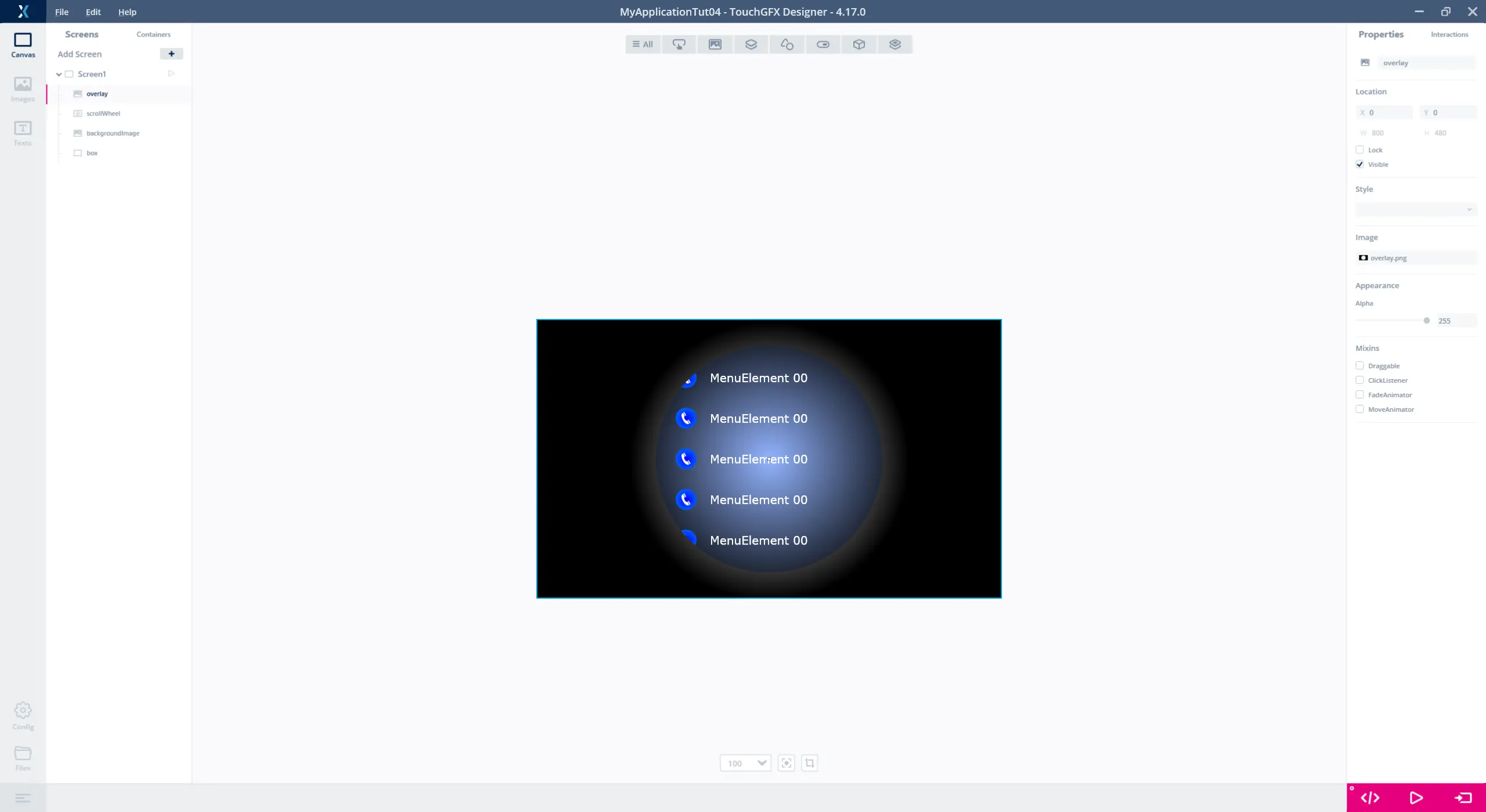 為了突出顯示「scrollWheel」的區域,使用第1步中下載的.zip檔中的兩張圖像background.png和overlay.png,並將它們作為圖像小工具新增至應用。 兩張圖像是背景,突出顯示「scrollWheel」的區域和一個覆蓋層,後者會在移動到「scrollWheel」的邊緣時隱藏「scrollWheel」中的選項。