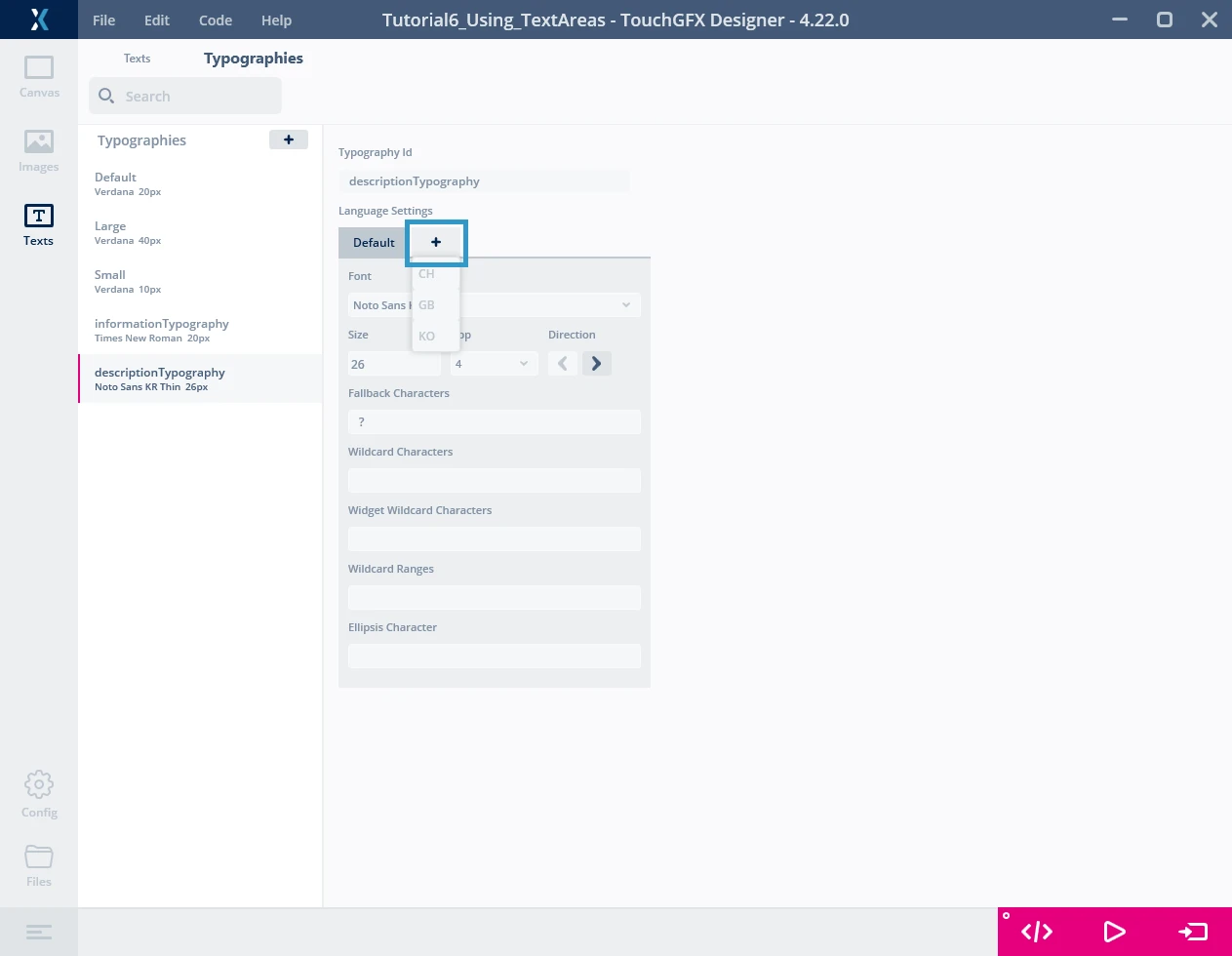 在此範例中,我們決定新增中文及韓文,以觀察TouchGFX Designer處理中文這類字元時的行為。