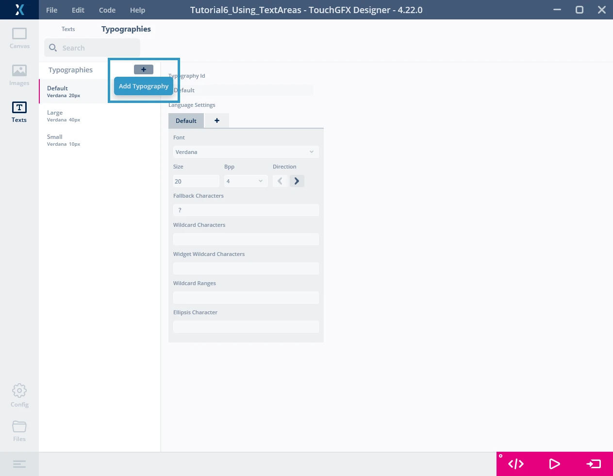 在TouchGFX Designer前往Texts(文字)索引標籤,然後前往螢幕頂端的Typographies(字體排印)區段。 點擊「+」圖示以建立新的字體排印。