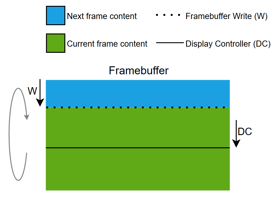 擁有一個影像緩衝區,可以將下一影格渲染到 像素被傳送到 GRAM 的相同影像緩衝區。 下一影格的渲染時間 受顯示器傳輸頻寬限制。 直到下一個影格準備好,才會啟動顯示器傳輸, 亦即不會有螢幕撕裂的風險, 因為顯示器控制器只是掃描 GRAM 中已有的內容。 下一影格的渲染在待更新的對應區域 傳輸到 GRAM 之前無法完成。