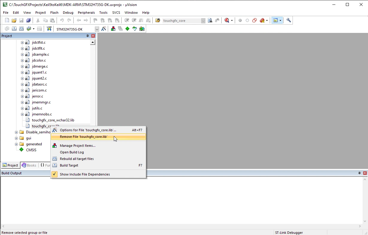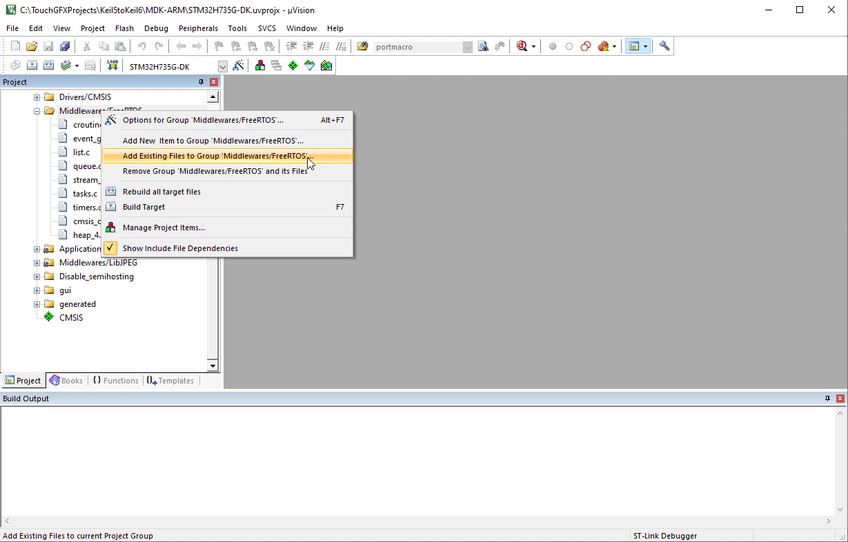 為了能夠連結 TouchGFX 函式庫,需要將專案中包含的函式庫變更為 Keil 編譯器 6 相容版本。 為此,請在檔案樹狀目錄中找到 touchgfx_core.lib 檔案 (應位於「Lib」類別),以滑鼠右鍵按一下父資料夾,然後按一下「將現有檔案新增至群組 xxx」。