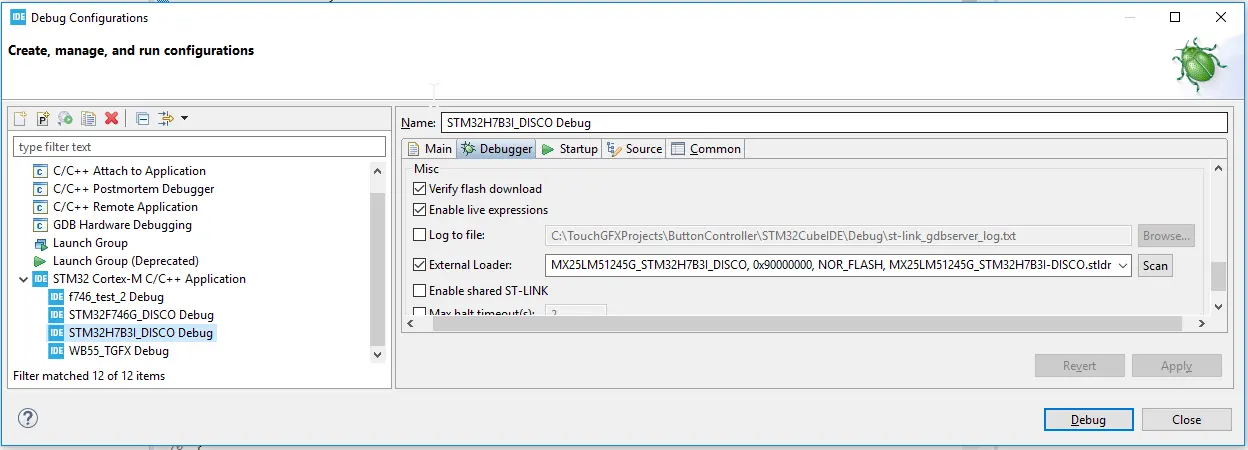 After pressing "Generate code" in TouchGFX Designer, open the STM32CubeIDE project, configure the debug configuration.